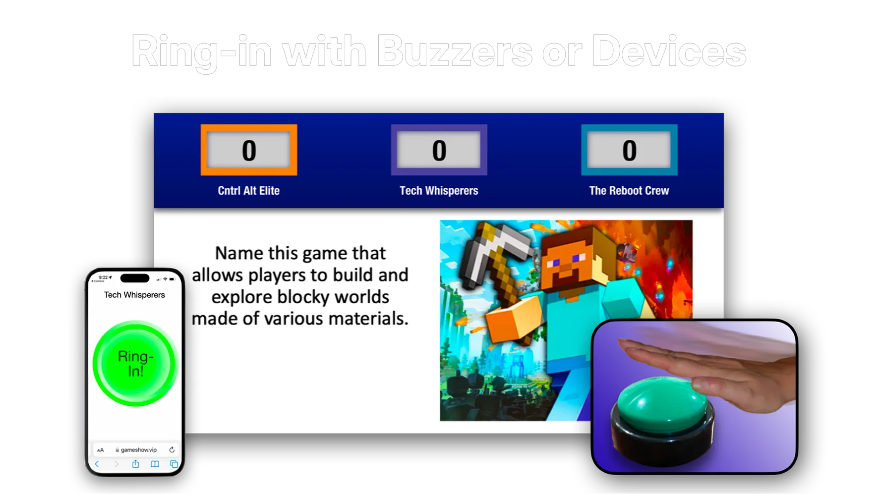 Contestants can ring in using physical slammers (available from third-party suppliers) or their own devices (phone, tablet or laptop)