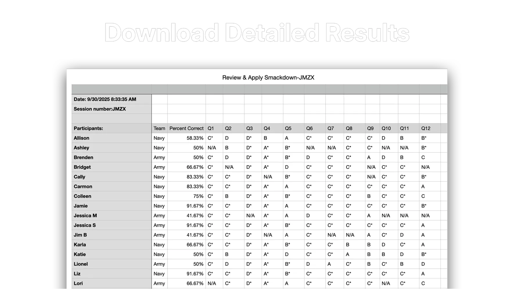 Gameshow Pro records key results from your session and exports them to a CSV file so you can review performance and spot learning gaps quickly.