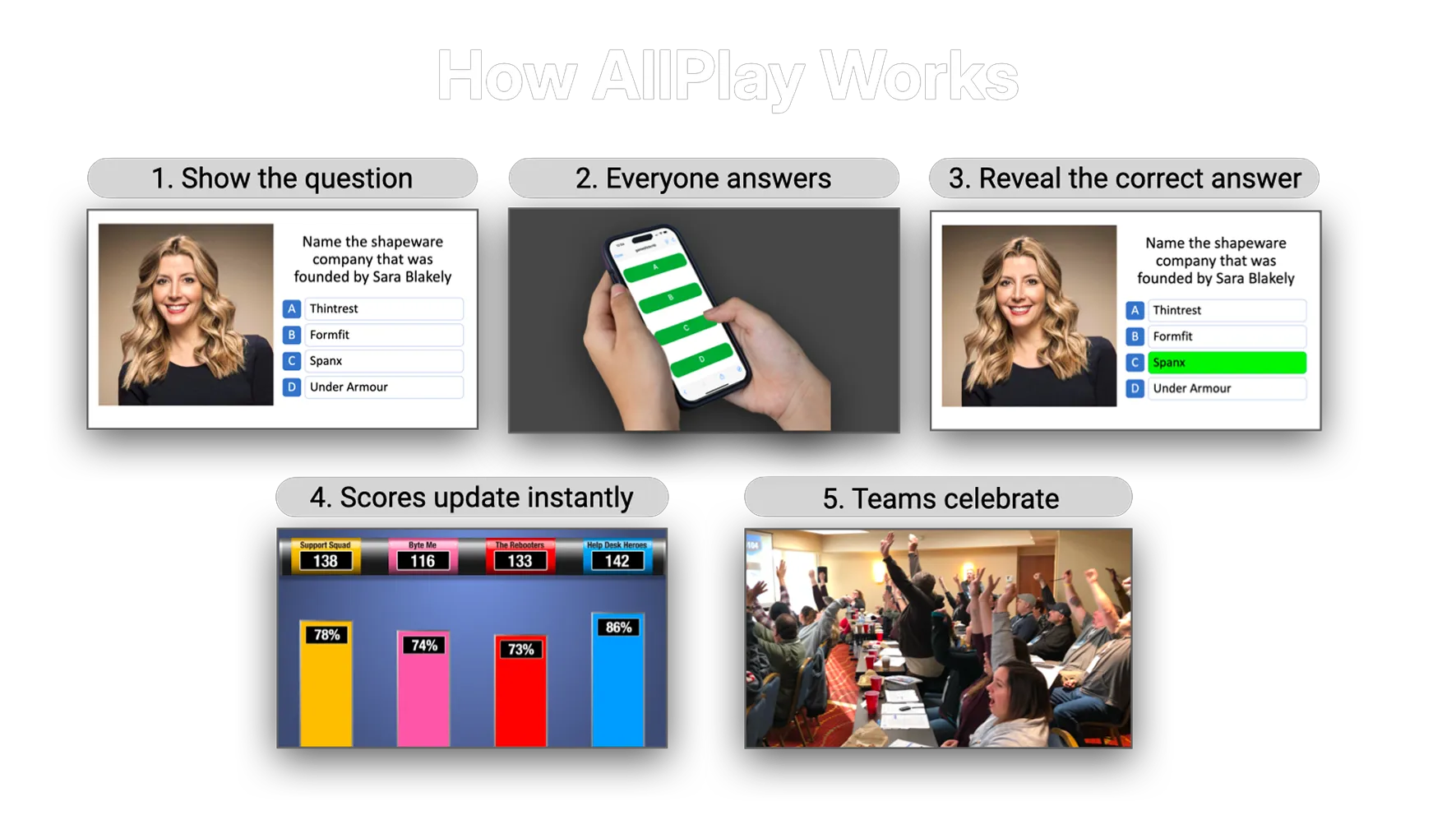 AllPlay is a high-energy game where everyone participates. Learners answer multiple-choice questions on their own devices—phone, tablet, or browser—keeping the entire room involved from start to finish.