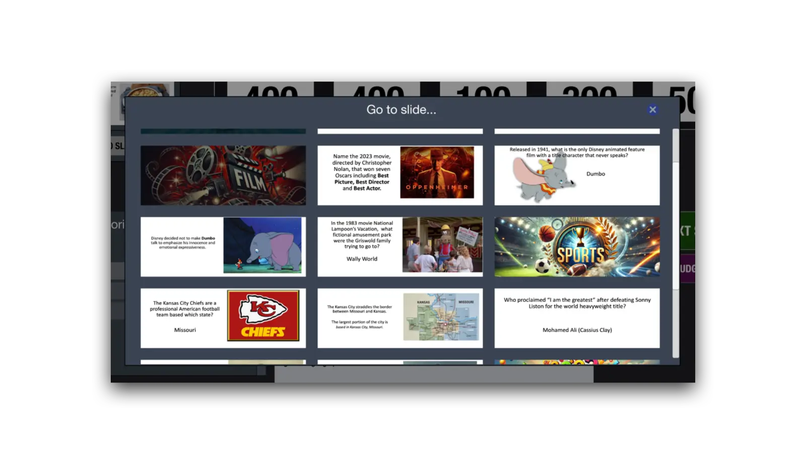 A collaborative, high-energy game designed for questions with multiple correct answers. It's ideal for survey results, procedures, lists, step-by-step processes, and anything with several key points to uncover.